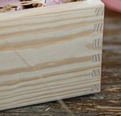 Drewniana skrzynka z trzema słoiczkami: miód z kakao, pomarańczą oraz maliną